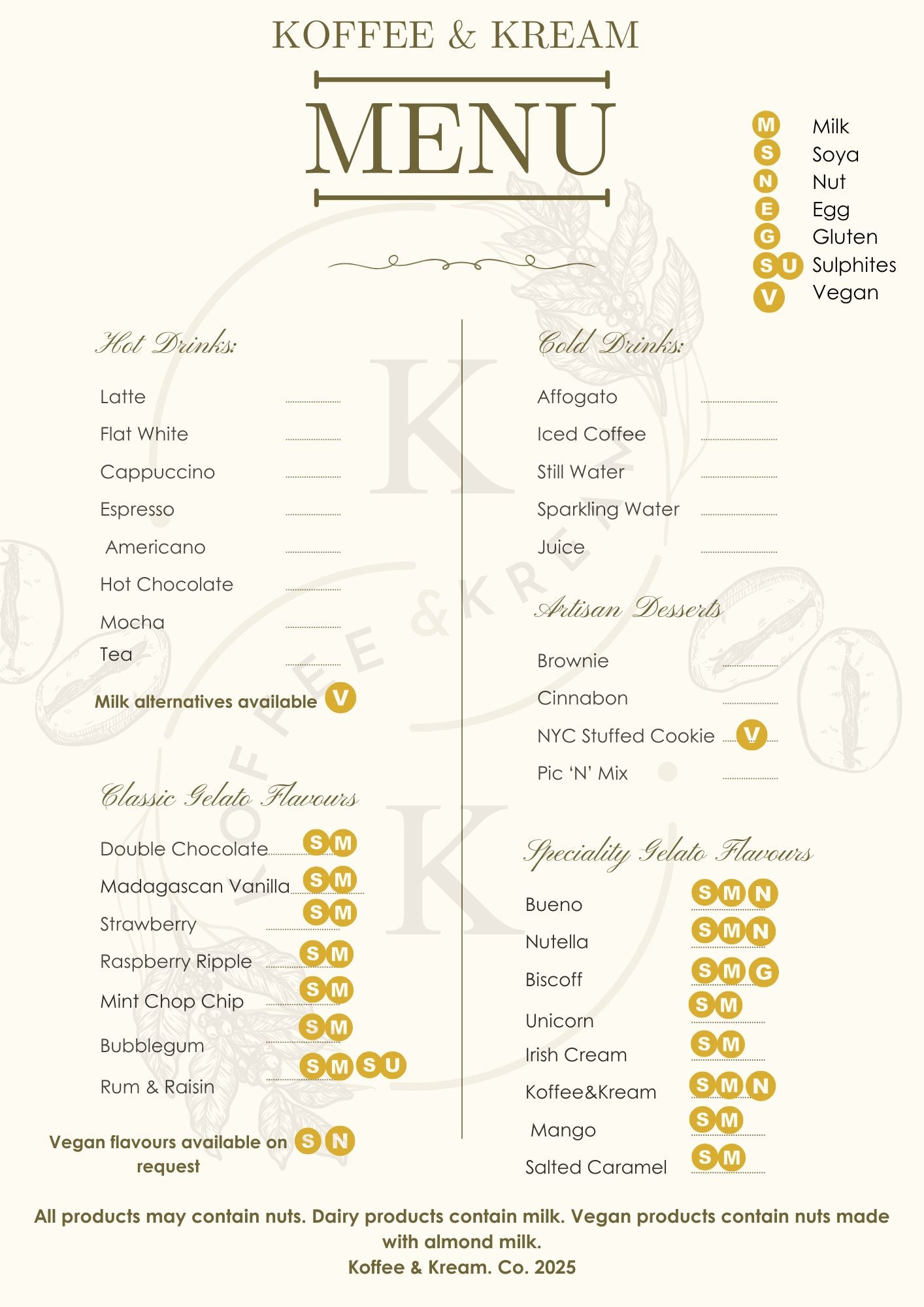 Explore the Koffee and Kream menu — featuring artisan coffees, handcrafted gelato, and indulgent desserts. From creamy lattes and fresh affogatos to rich brownies and NYC stuffed cookies, every treat is made with care. Available for events and celebrations across Leeds and West Yorkshire.